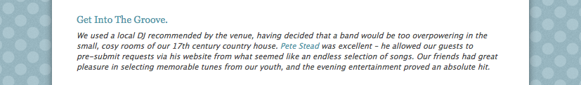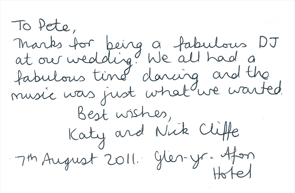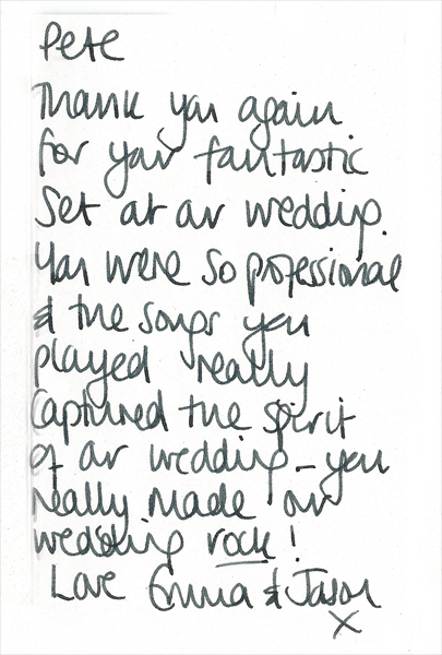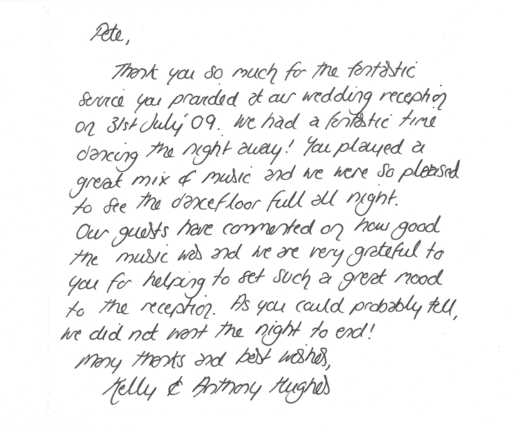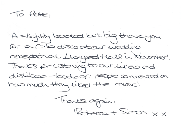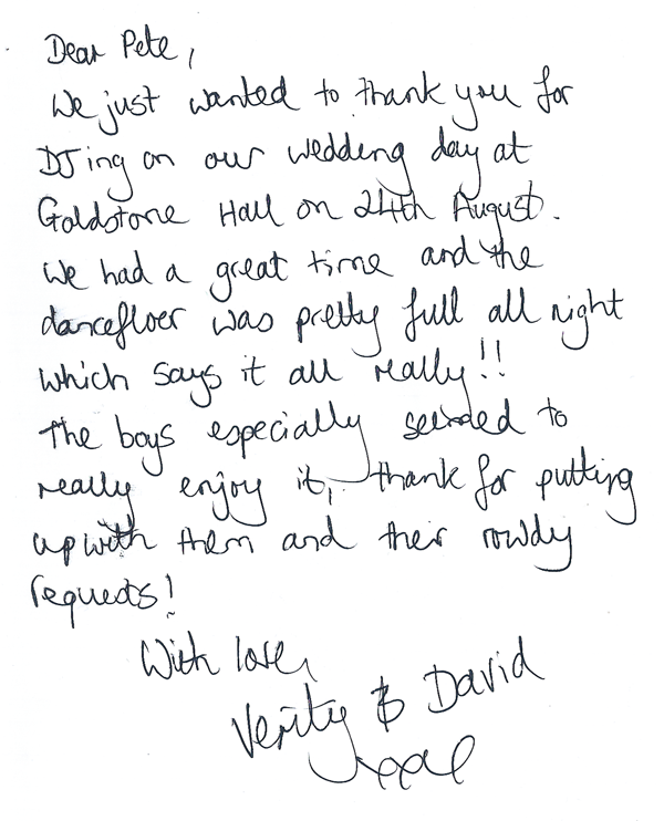 It has always been our goal to provide a service that truly speaks for itself, we have built a reputation for delivering best-in-class entertainment, that consistantly exceeds expectations. Here we showcase a selection of feedback from satisfied couples, venues and fellow wedding professionals, to give an idea of what people are saying about us. It is always a pleasure to read the thank you notes and testimonials that are sent to us after an event, and getting that fuzzy feeling, knowing that our efforts went towards making a particular day extra special. The facebook page is constantly being updated with the latest reviews, testimonials and thank-yous, so be sure to take a look to see what Pete has been getting up to.